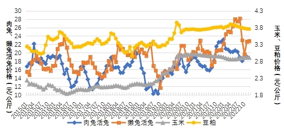 圖1 2011年—2022年兔及兔產(chǎn)品平均價(jià)格走勢(shì) (右坐標(biāo)為兔毛價(jià)格)