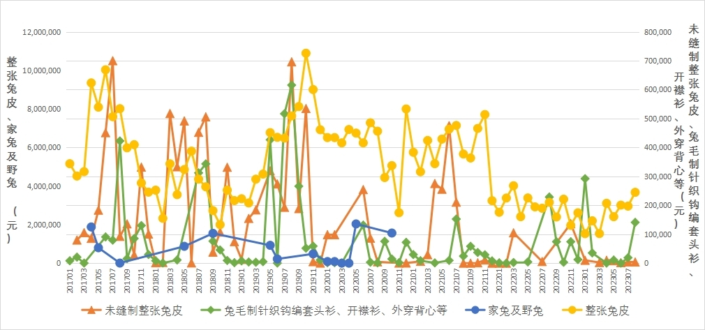 圖6 2017年1月-2023年8月其他兔產(chǎn)品出口額走勢(shì)