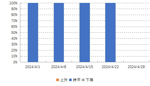 通過對(duì)中間環(huán)節(jié)集散地的價(jià)格進(jìn)行監(jiān)測(cè),與2024年3月份相比,2024年4月份中除第四周數(shù)據(jù)缺失外,其余每一周的銷售情況都為100%持平(見圖3)。