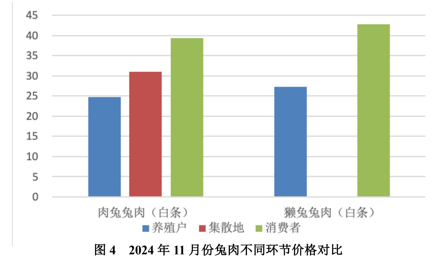 2024 年 11 月份養(yǎng)殖戶的肉兔兔肉銷售價格、中間商的集散價格和超市的零售價格分別為 24.74 元/公斤、31.03 元/公斤、39.34 元/公斤。11 月份集散地肉兔兔肉價格比養(yǎng)殖戶銷售的兔肉價格高 25.45%,超市消費價格比集散地的兔肉價格高 26.77%,比養(yǎng)殖戶銷售的兔肉價格高 59.03%。養(yǎng)殖戶的獺兔兔肉銷售價格和超市的零售價格分別為 27.23 元/公斤、42.75 元/公斤,超市的獺兔兔肉價格比養(yǎng)殖戶銷售的兔肉價格高 57%。與上月相比,雖然養(yǎng)殖戶和集散地的銷售價格下降,但消費者從超市購買兔肉的價格略有上升。