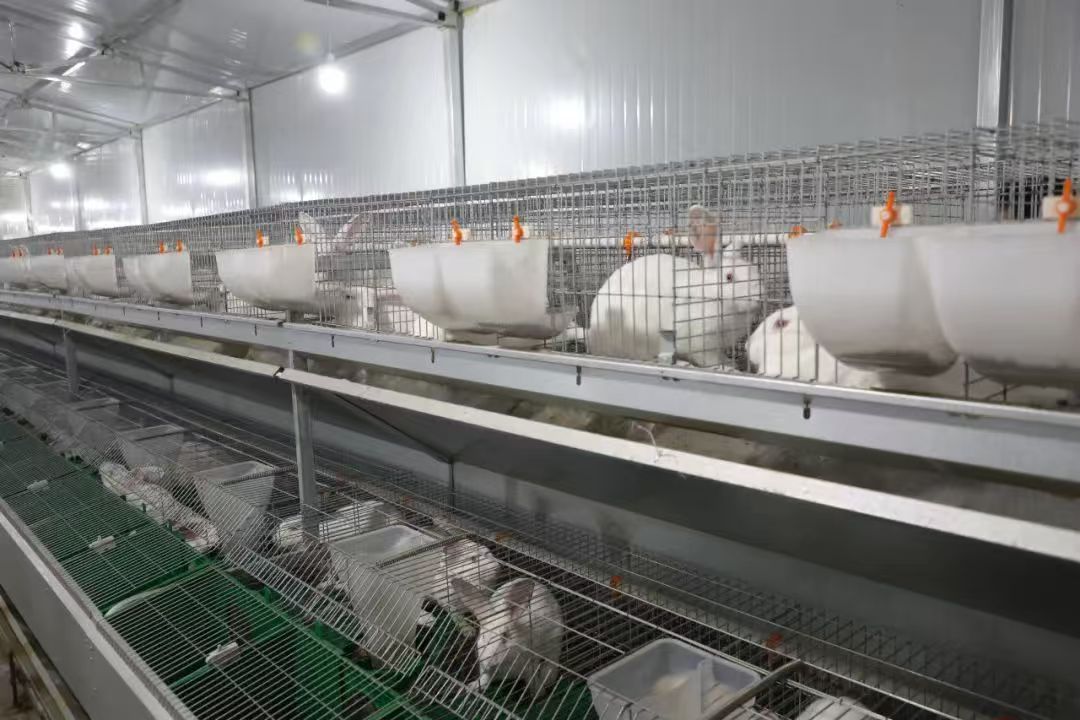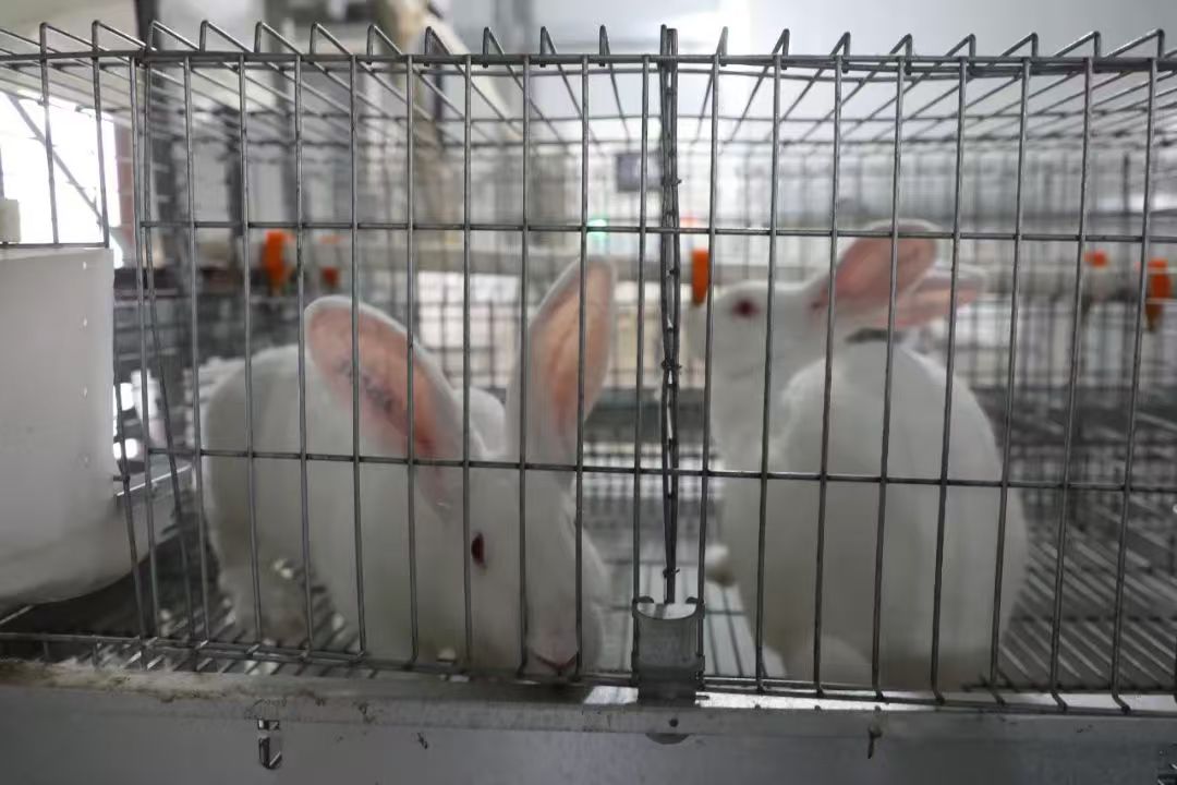 走進養(yǎng)殖基地,一排排整齊的兔舍映入眼簾?;\內(nèi)一只只雪白的、毛茸茸的兔子圓滾可愛,有的在悠閑地進食,有的在瞇眼打盹,有的興奮地豎起耳朵四下張望,工作人員正熟練地加食、加水、清理糞便。