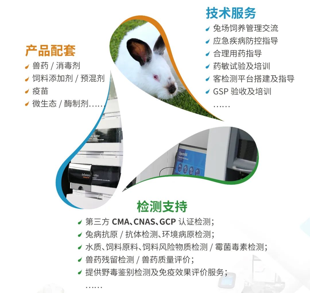 為更好的服務(wù)中國兔業(yè)發(fā)展,攜手兔業(yè)人共同應(yīng)對市場變革,解決市場需求,青島蔚藍(lán)生物、青島康地恩藥業(yè)開放集團(tuán)旗下獸藥、疫苗、酶制劑、微生態(tài)全產(chǎn)業(yè)研發(fā)、檢測、生產(chǎn)、服務(wù)平臺,圍繞兔業(yè)健康養(yǎng)殖,為廣大同仁提供如下技術(shù)輸出: