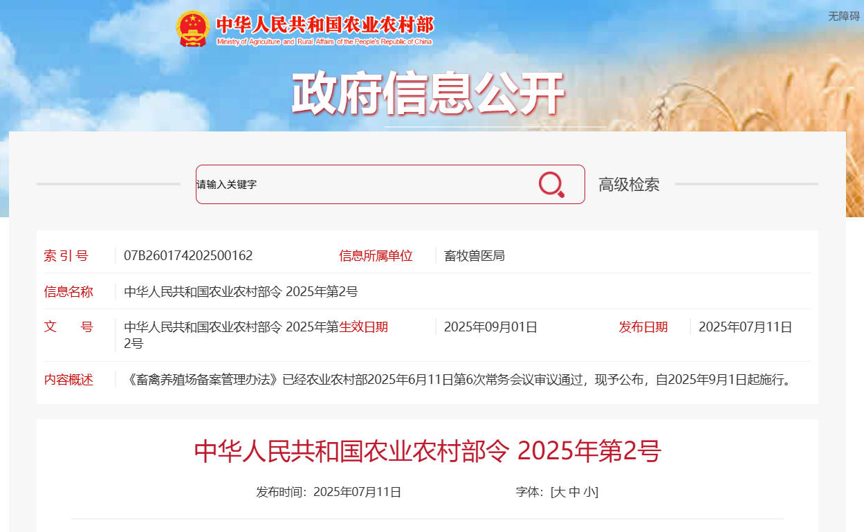 《畜禽養(yǎng)殖場備案管理辦法》已經(jīng)農(nóng)業(yè)農(nóng)村部2025年6月11日第6次常務會議審議通過,現(xiàn)予公布,自2025年9月1日起施行。