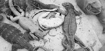 圖為已經(jīng)死去的圓鼻巨蜥 本報記者 蔡巖紅 5776只奄奄一息的巨蜥被裝在一個個藍色和黃色的編織袋中,260只馬來西亞閉殼龜和370只亞洲巨龜被牢牢地封在木箱中,而1170
