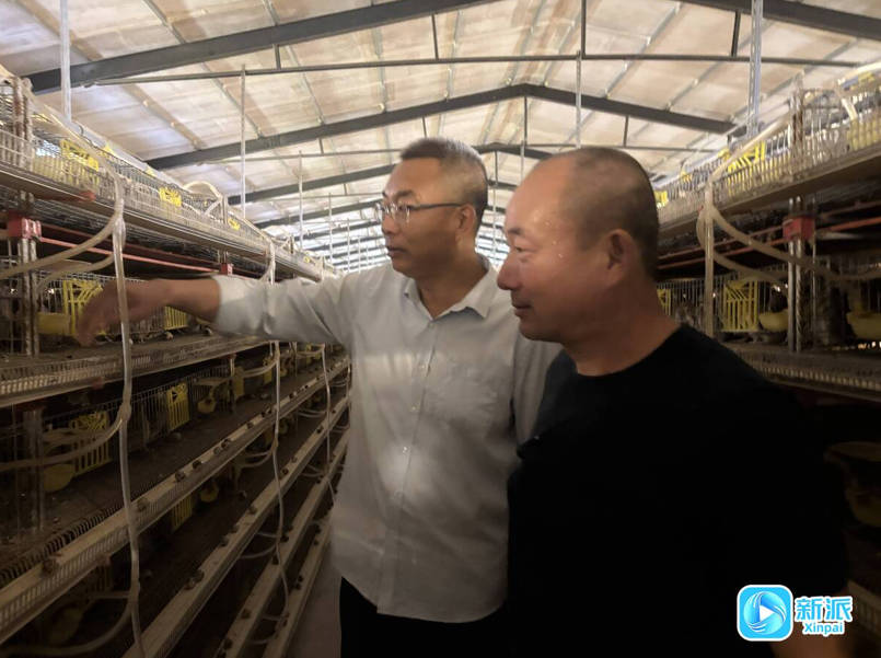 付興鵬(左)和工作人員查看鵪鶉生長(zhǎng)情況。