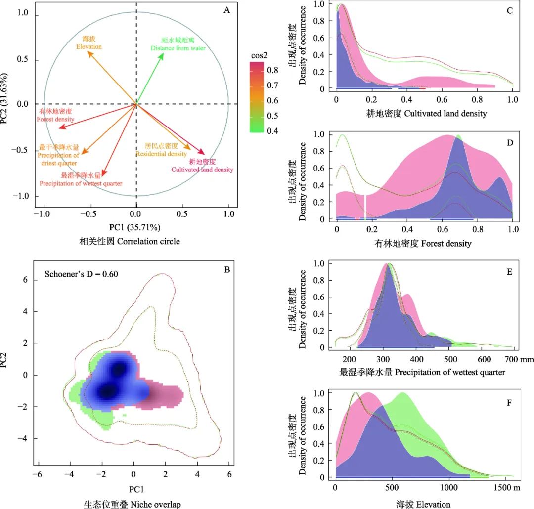 (2)水貂和水獺生態(tài)位存在高度重疊,Schoener’s D值達(dá)到0.60。單因子生態(tài)位分析結(jié)果表明,水獺比水貂對(duì)耕地密度更加敏感,集中分布在低耕地密度區(qū);水獺和水貂均傾向選擇有林地密度較高的區(qū)域,但水貂在有林地密度的選擇上更加平滑,對(duì)森林的依賴(lài)程度比水獺低;水貂相比水獺更傾向選擇降水量低的區(qū)域;水獺比水貂更傾向選擇高海拔的棲息地。