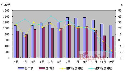 2008年,中國進出口25616.3億美元,增長17.8%,增速比上年回落5.7個百分點。其中出口14285.5億美元,增長17.2%,回落8.6個百分點;進口11330.9億美元,增長18.5%,回落2.3個百分點。由于中國出口企業(yè)綜合競爭能力不斷提高,適應國際市場變化的能力不斷增強,加上國際金融危機影響存在一定滯后性,前10個月,中國對外貿(mào)易增長總體平穩(wěn),進出口21886.7億美元,增長24.4%,其中出口12023.3億美元,增長21.9%,進口9863.4億美元,增長27.6%,7、8、9月當月進出口額均超過2400億美元,創(chuàng)歷史新高。但隨著國際金融危機的影響不斷加深和蔓延,11月份,中國對外貿(mào)易形勢發(fā)生逆轉(zhuǎn),進出口額同比下降9%,其中出口下降2.2%,是2001年7月以來首次下降;進口下降17.9%。12月份,中國進出口降幅進一步擴大到11.1%,其中出口下降2.8%,進口下降21.3%。