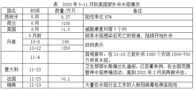 自2020年4月份,西班牙首先報道水貂集中感染新冠病毒和撲殺事件以來,荷蘭等歐美其他國家也陸續(xù)開始報道,同時也報道了水貂感染人,導(dǎo)致人大量發(fā)生新冠病毒的事件。截至2020年11月底,世界衛(wèi)生組織宣布7個國家水貂集中感染事件,并撲殺水貂。歐美國家撲殺水貂情況見表。